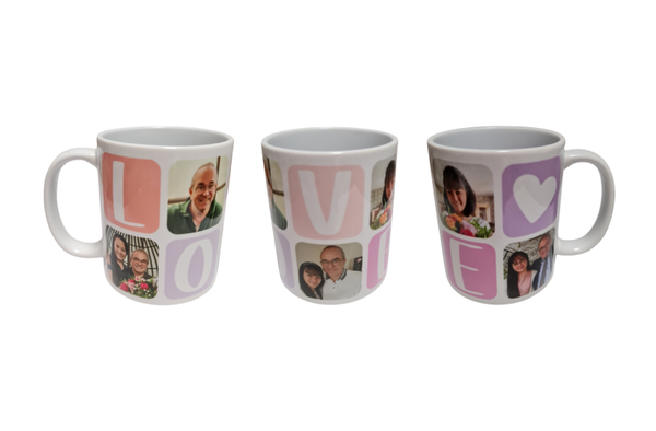 Bitte laden Sie insgesmt 5 Fotos hoch, dann bedrucken wir eine Keramiktasse wie auf den Fotos dargestellt ist. Der Druck ist abriebfest, lebensmittelecht und sehr beständig. Auch nach langer Zeit und häufigem Spülen wird der Aufdruck nicht blass.